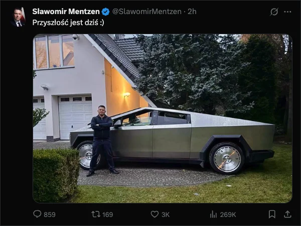 Sławomir Mentzen zaprezentował w mediach społecznościowych swój nowy samochód — futurystyczną Teslę Cybertruck. Pojazd przyciąga uwagę nie tylko charakterystycznym wyglądem, ale też detalem, który kryje się na srebrnych felgach.